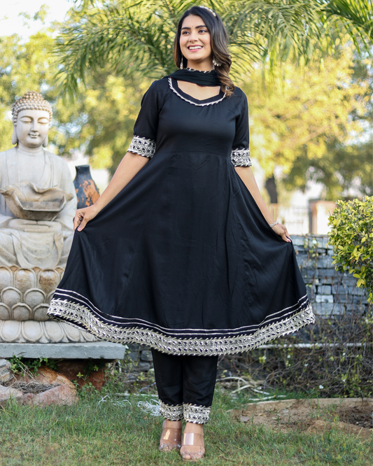 Black Makdi Rayon Anarkali Kurti Set with Lace Work, Pant & Dupatta