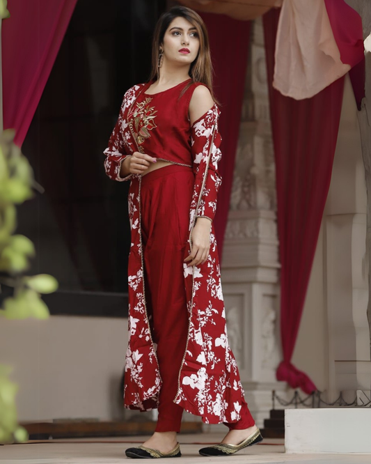 Rayon Printed Shrug with Embroidered Choli and Dhoti Set