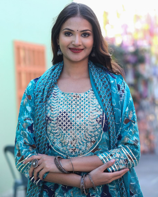Shree Satin Print Teal & Multi-Color Traditional Suit Set with Dupatta