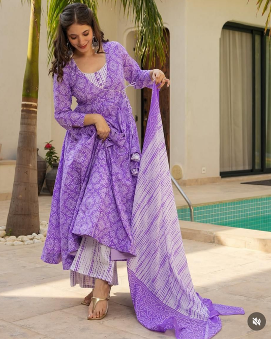 Lavender Cotton Bandhej Anarkali Suit Set with Dupatta