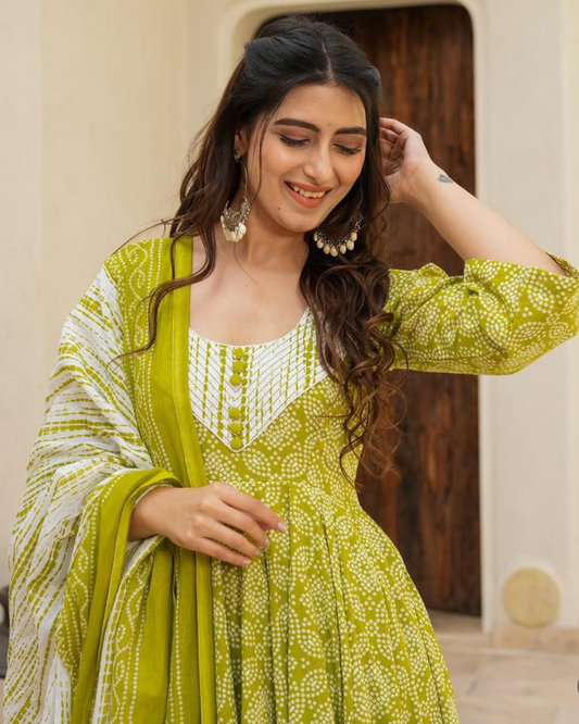Lime Green Cotton Bandhej Anarkali Suit Set with Dupatta