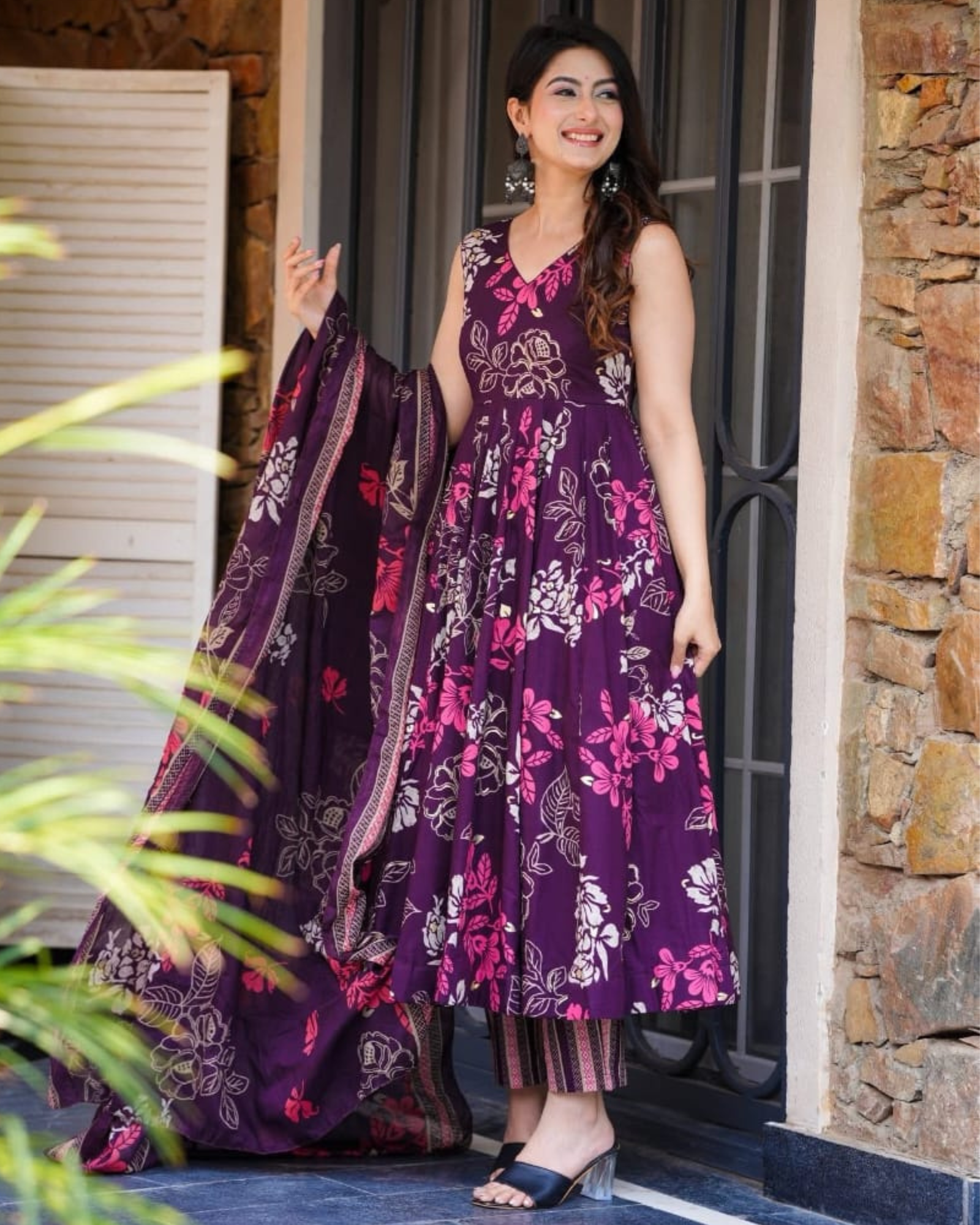 Elevate your wardrobe with this purple floral cotton Anarkali kurta set, featuring a graceful silhouette and delicate floral prints. Paired with stylish striped pants and a matching dupatta, it offers a refined blend of comfort and elegance, perfect for festive occasions and casual outings alike. Crafted from breathable cotton, this ensemble ensures all-day comfort while enhancing your ethnic charm with a contemporary twist.